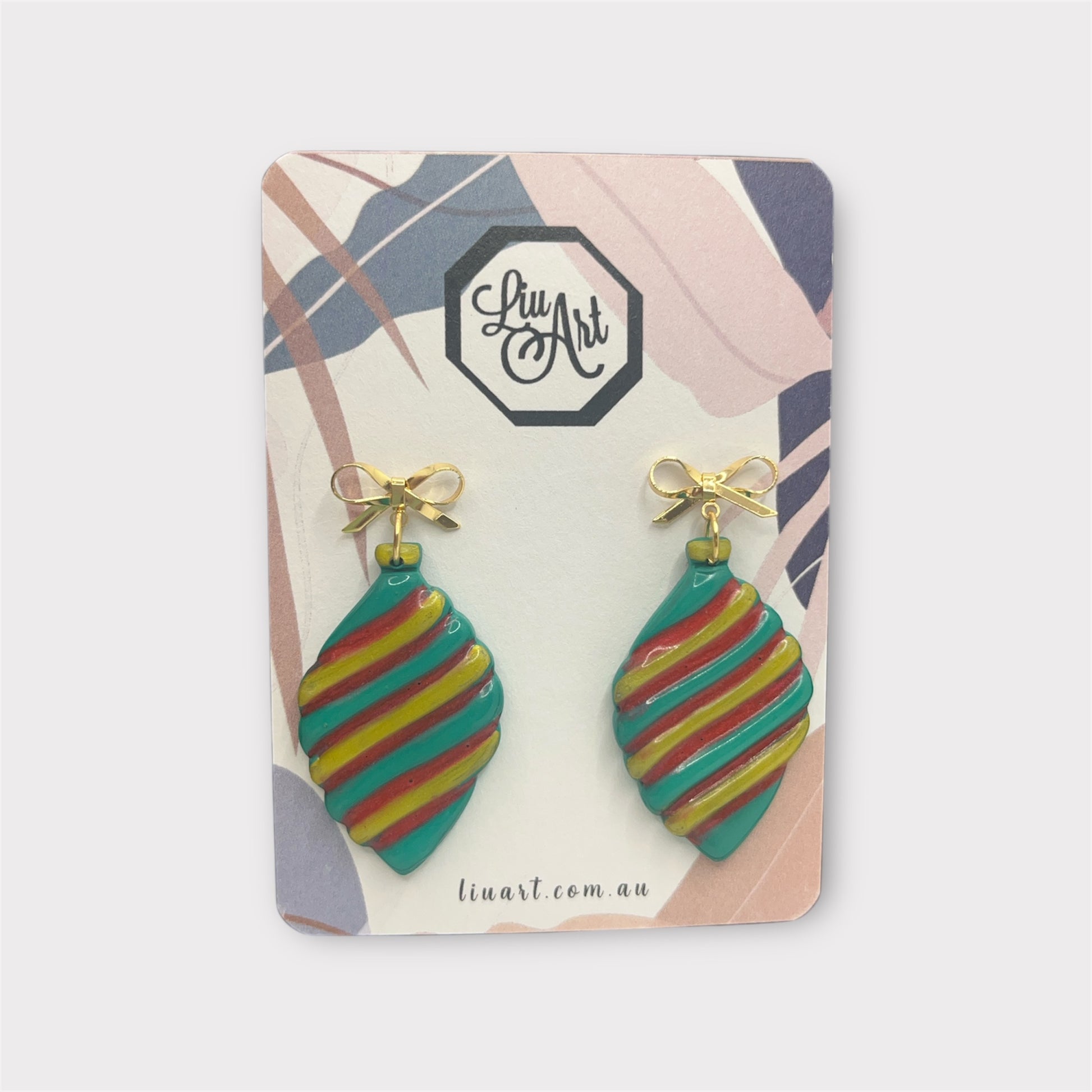 Handcrafted polymer clay earrings shaped like festive Christmas ornaments, featuring hand-blended red, green and gold swirls sealed with a glossy resin top coat and finished with delicate gold bow studs. A cheerful and artistic touch to brighten up any holiday outfit.