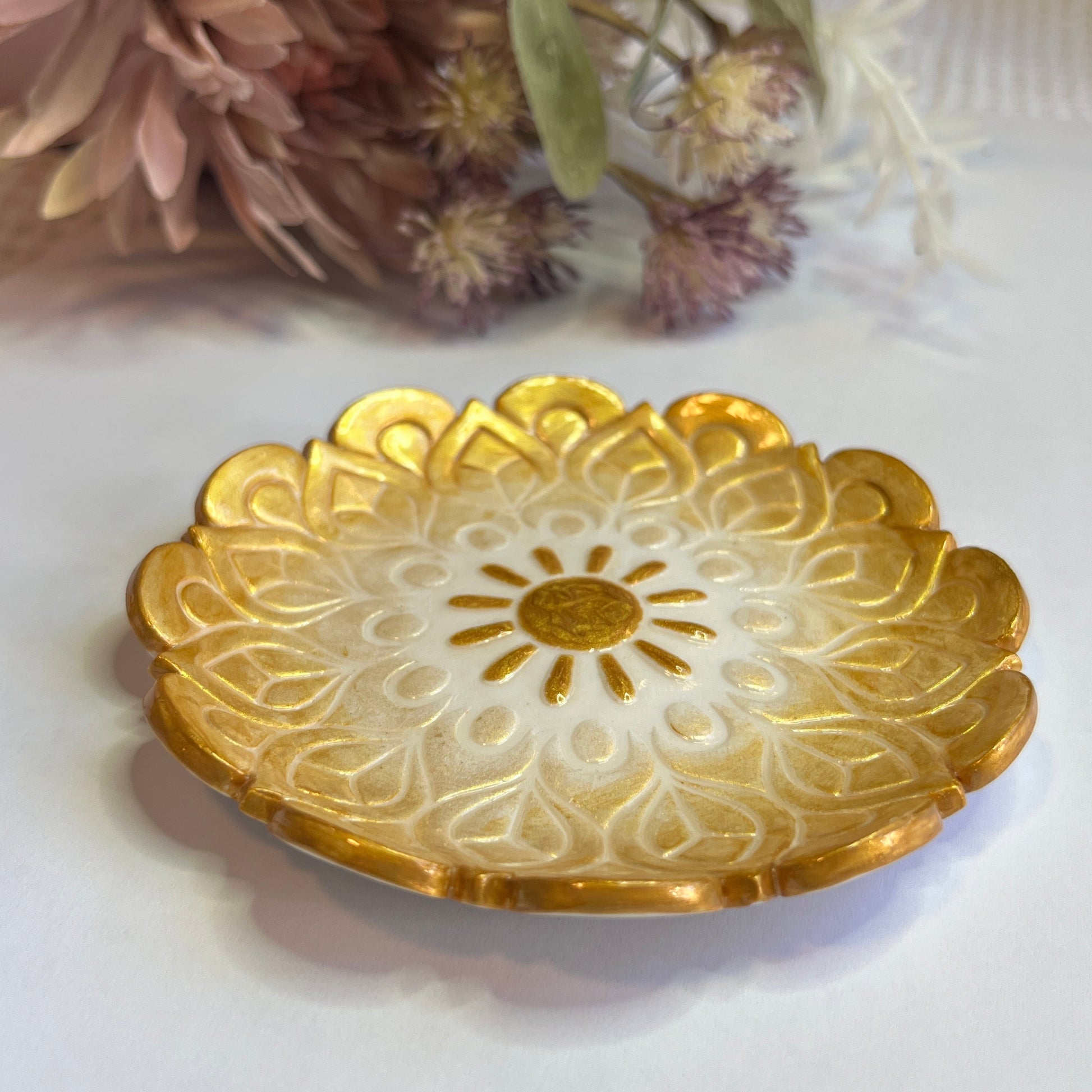 Handcrafted polymer clay trinket dish featuring a stunning raised lotus mandala pattern, sealed with a glossy varnish for a radiant finish. The golden accents bring warmth and elegance to your space, making it perfect for holding earrings, rings or small keepsakes.